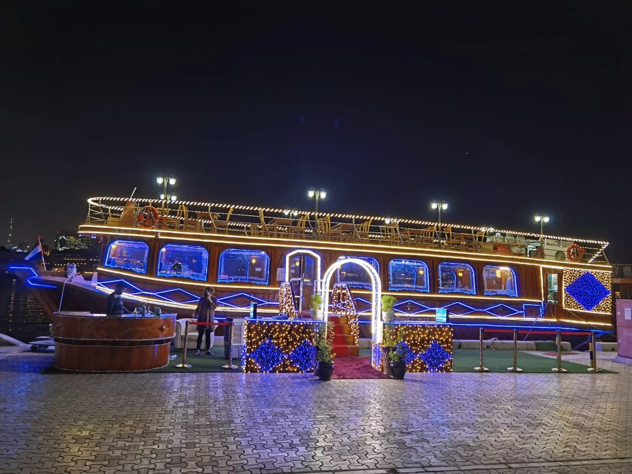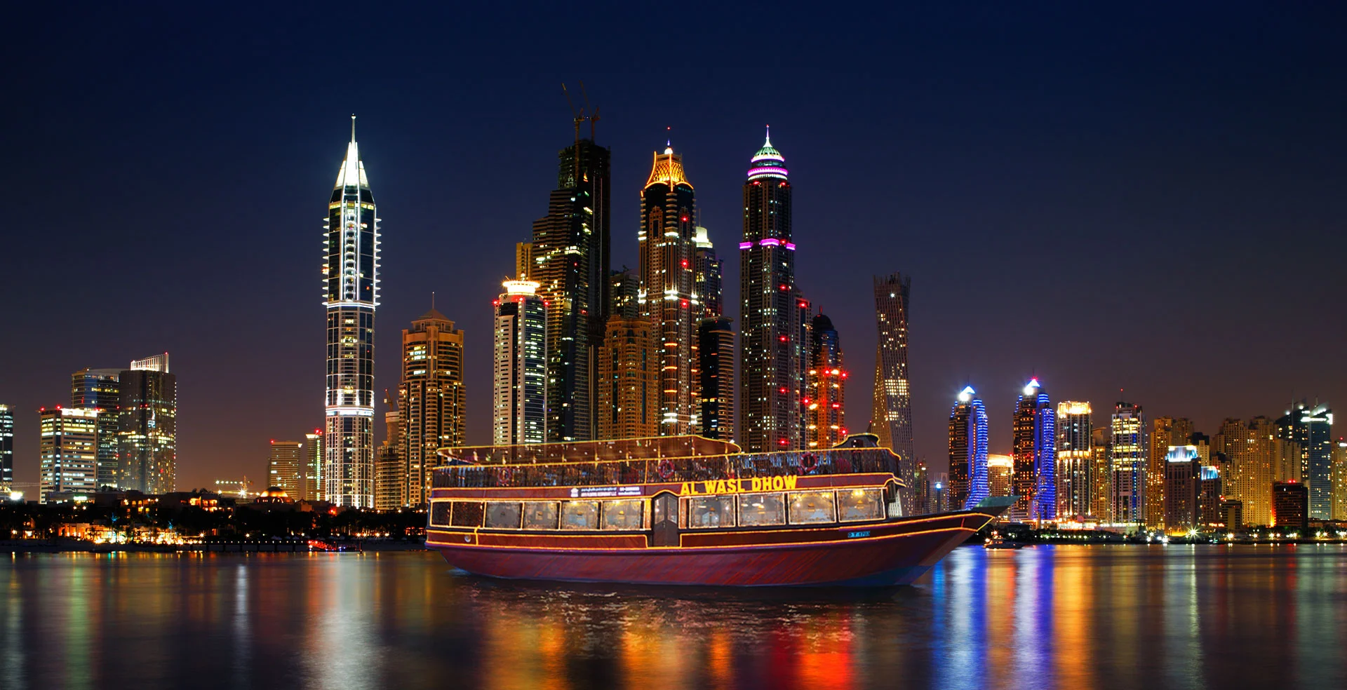 Step aboard a beautifully crafted wooden dhow, a tribute to Dubai’s seafaring past. As the city lights reflect on the water, unwind on the open deck or in the elegant indoor seating area. Along the way, take in stunning landmarks, from heritage sites and bustling souks on the Creek to the sleek skyscrapers lining the Marina.
