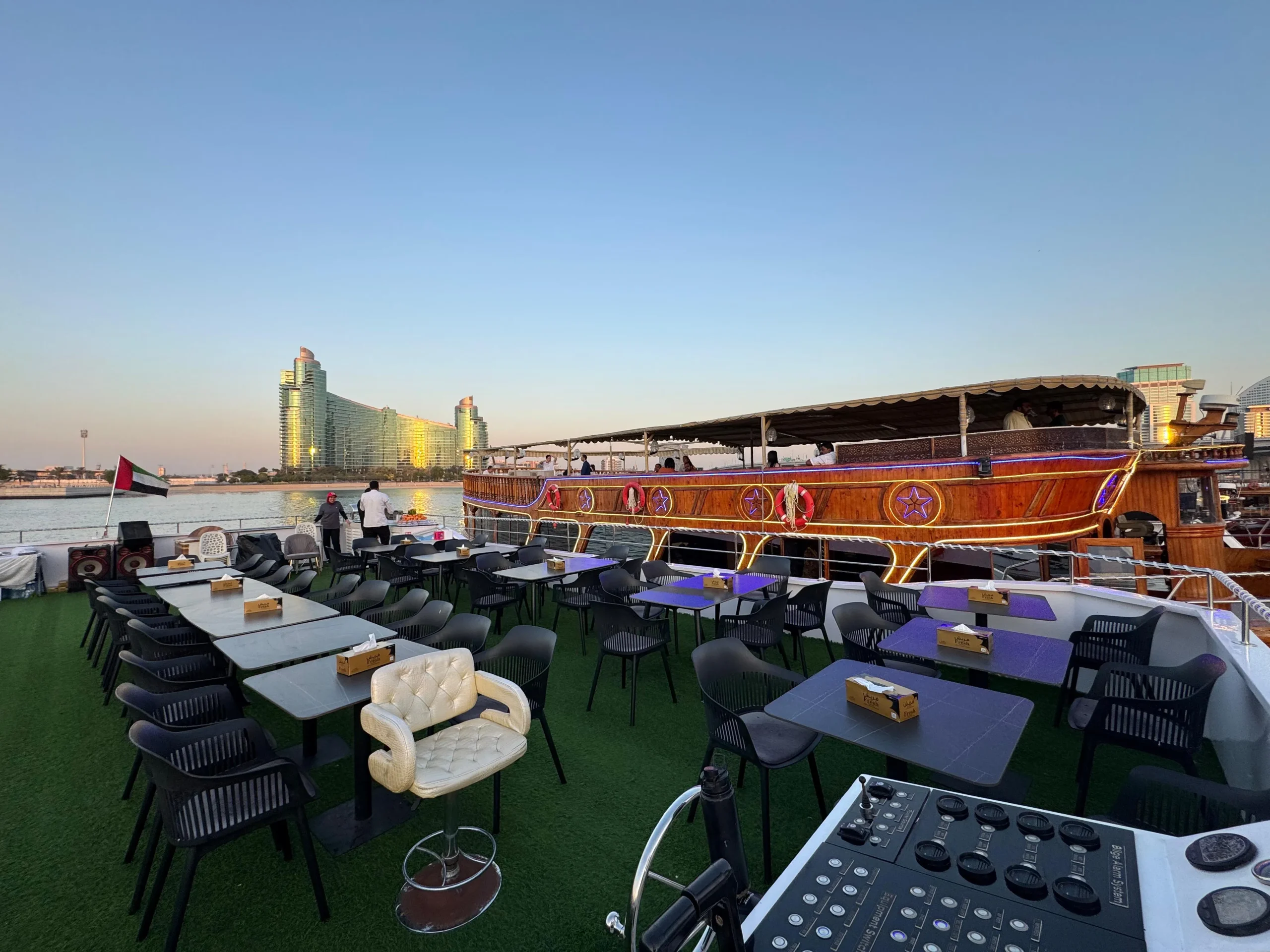 Admire the stunning landmarks along the water, including the Burj Khalifa, the Dubai Fountain, and other famous structures, all beautifully illuminated at night. Relax on the open-air deck or in the air-conditioned lounge, taking in the serene atmosphere and the breathtaking views of Dubai’s skyline.