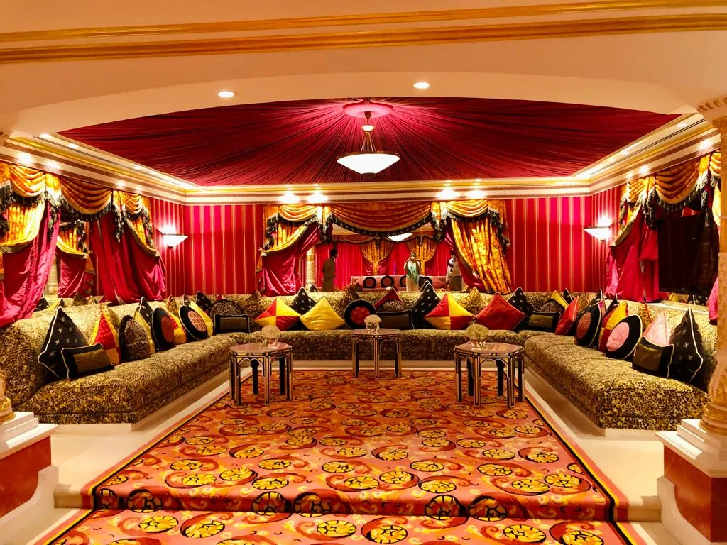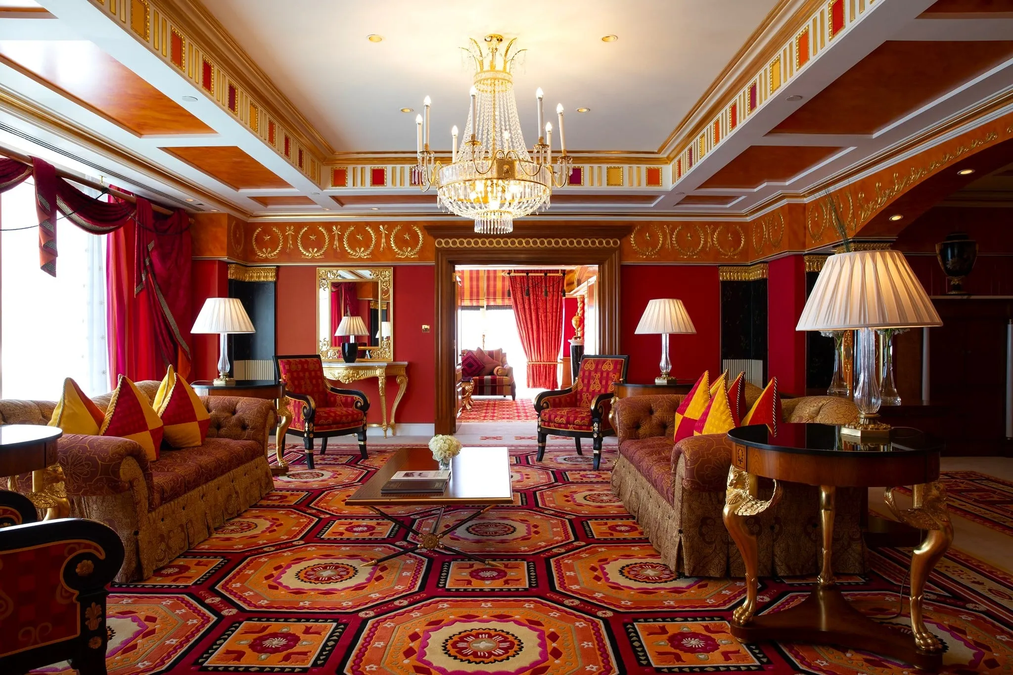 As you enter the suite, soaring ceilings and sweeping views of the Arabian Gulf welcome you. Walk through grand living areas adorned with vibrant colors, intricate patterns, and plush furnishings. The private dining room, opulent bathrooms with 24-karat gold fixtures, and expansive bedrooms redefine indulgence, showcasing the pinnacle of Emirati hospitality.